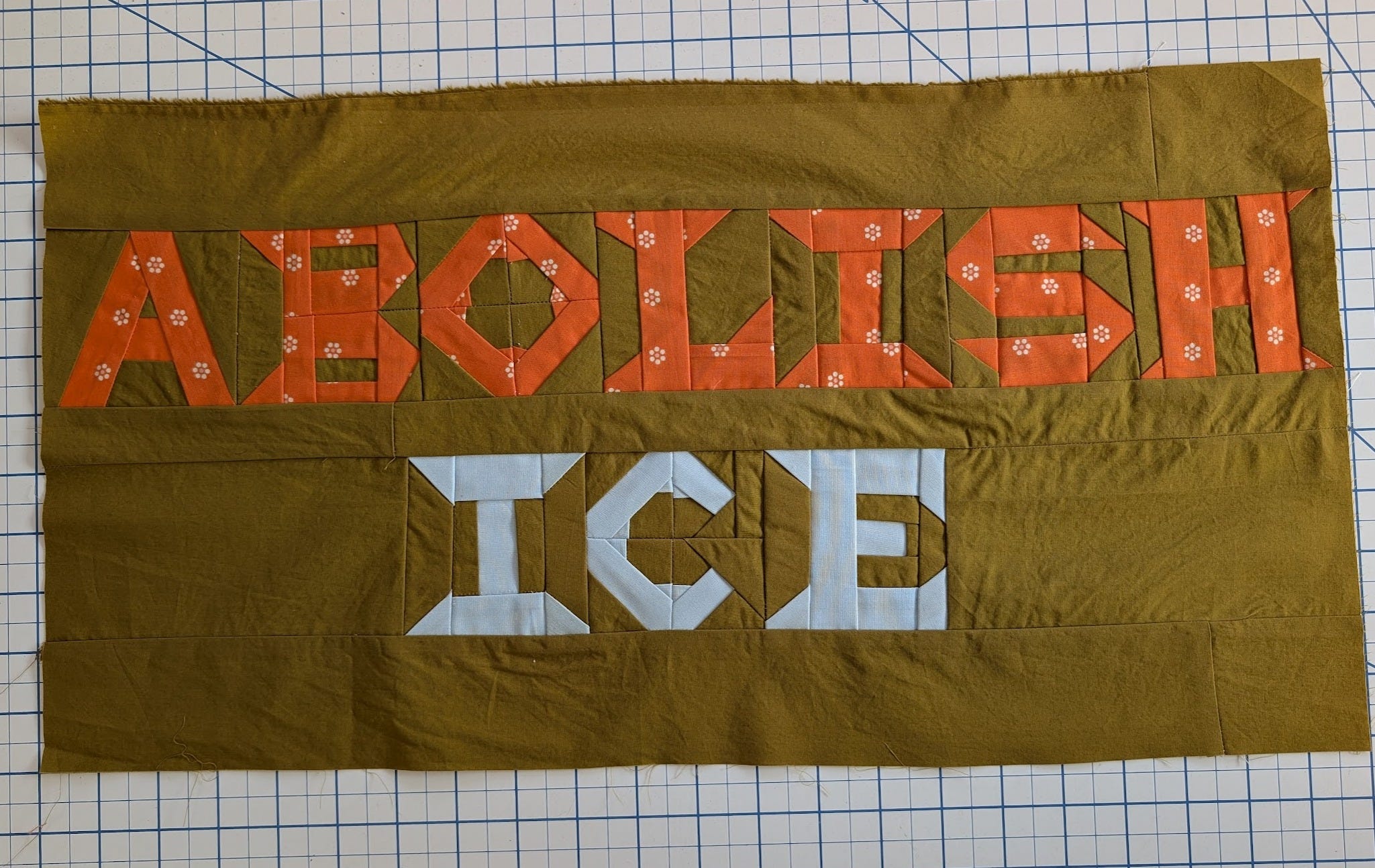 Sometimes it feels small to create art in a time of such intense fear and consequence, but then I see work like Jessie Telfair’s Freedom Quilt and am reminded that we stand on the shoulders of giants. Our horror may be packaged in alarming new ways and delivered through screens in our pockets, but the people have always marched, and the people will always march. Songs, speeches, and art echo through generations and clasp our shoulders as if to reassure us. Our struggle is not so new, but what a tender and naive thought that is to sprout. I made this to hang in our front window in solidarity with Minnesota and the families and communities ICE is terrorizing and the peaceful protesters they’ve murdered. I linked the foundation paper piecing letter templates I designed with my husband at the bottom for you in case you’d like to make one for your window or next protest. I made some small edits for style and ease of sewing since making this, so yours will look slightly better than mine.
