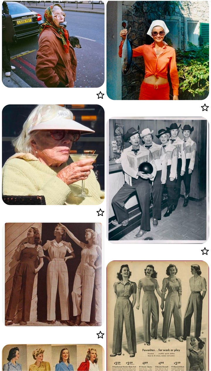 I currently have 304 images in an album on my phone called “drafting inspo” with the earliest image dated 11/11/2020. It is a huge jumble of sources, anything from vintage advertisements to the actual insides of a ready-to-wear garment with an interesting construction detail. There are certain design details that always catch my attention, so I have many pictures of slight variations of things like my favorite collar styles or interesting use of elastic cinching. Sometimes I have a loose idea of a full garment I’m interested in drafting someday, and sometimes it’s a small detail I have no idea if or how it will eventually slip into one of my patterns. Sometimes something seemingly random catches my attention, and I snap a picture only to realise that I’ve been collecting similar images subconsciously for months. When I get in a creative funk, I visit this visual soup of ideas to see what catches my energy in that moment and remind myself of the limitless options I’ve already amassed.